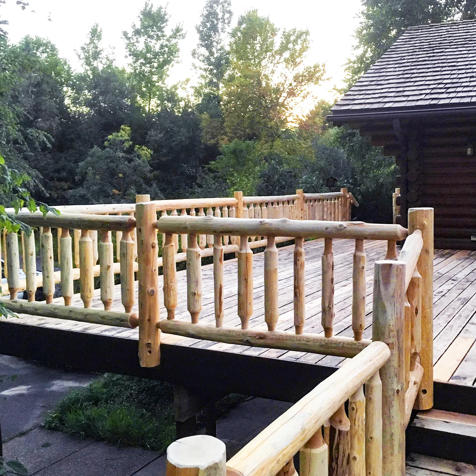 Spindle log railing is a custom cedar for decks, porches, lofts, new construction, and log homes. We never use turned or machined logs in creating our natural cedar log railing. Each log is hand-selected and peeled before it is crafted using our on-center tenon process. This ensures that every railing section is unique and beautiful, just as nature intended.